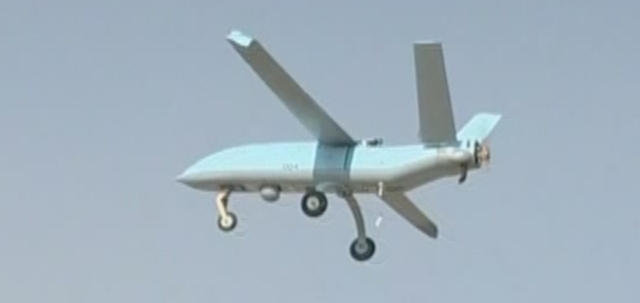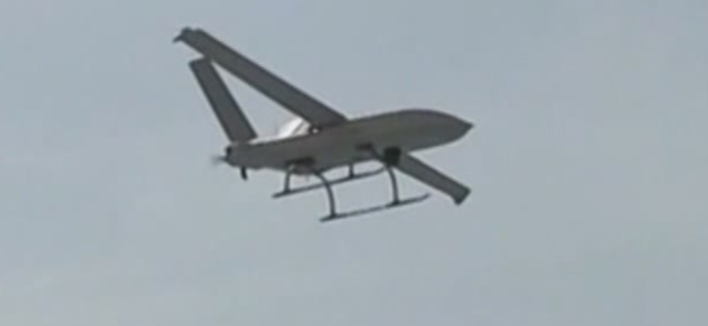 The above is a brand new aircraft seemingly available in dual configuration: landing gear (image above) or skids (image below). It seems to be smaller in size than the “Hermes 450″-type of UAS but it features a large fuselage (if compared to the size of the wings) and camera.