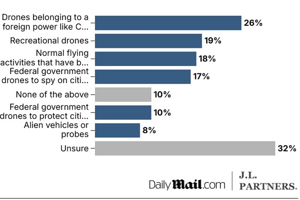 Exclusive polling from DailyMail.com and J.L. Partners found that nearly half (45 percent) of people believe the bizarre activity was more than just recreational or normal drone use, with the majority (26 percent) of those respondents pointing to foreign surveillance.