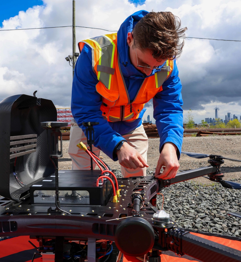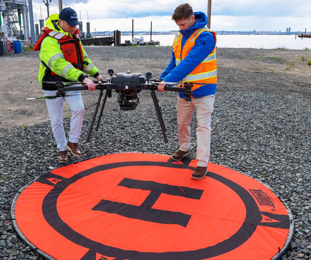 On a recent May morning with clouds threatening to rain on a small crew of the agency’s emergency management staff, Port Authority police, New York New Jersey Rail (NYNJR) officials and NUAIR personnel, a black heavy-lift autonomous drone lifted 150 feet up from the gravel of Greenville Yards and sped across the Hudson River.