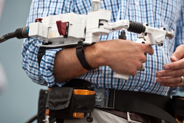 That said, not even an unmanned aircraft as autonomous as the X-47B is without human companionship. A Northrop test pilot named Gerrit Everson can prove it: on his forearm is a white box called the Control Display Unit. Packed with six buttons and cabled to a battery pack strapped to the small of Everson’s back, it’s kind of like if Nintendo created a Power Glove for flight-deck operations. The control unit can power the aircraft up once it’s latched to a carrier catapult and take control of it once it lands and needs to be moved elsewhere on the carrier. Everson grips a handle and flicks his wrist; if the X-47 was powered up, its nose would along with his wrist.