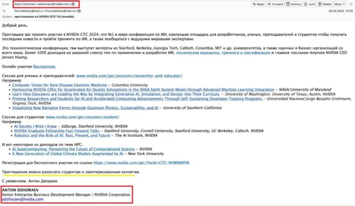 A recent email dated February 26, 2024, invited “Albatros” to the NVIDIA GTC 2024, a leading conference on artificial intelligence. Dzhorayev suggested that invitations could also be sent to students and interested colleagues, likely referring to students from “Alabuga Polytechnic,” who are involved in drone assembly. This indicates Dzhorayev’s awareness of “Albatros,” the “Alabuga” special economic zone, and their activities.
