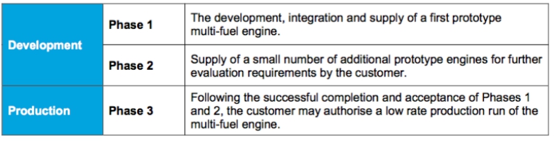 Under the MoU, an initial contract has been signed to commence work within Phase 1 of the program. This initial phase of work is anticipated to be completed within the next 18 months. Commencement of Phases 2 and 3 of the program are dependent on the successful completion and acceptance by the customer of the first prototype engine identified in Phase 1.