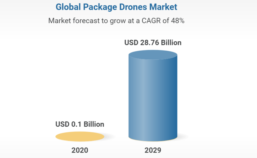 The "Global Package Drones - Market and Technology Forecast to 2029" report finds that the market is expected to grow with a CAGR of 48% between the forecast period (2021-2029). The market is poised to attain a value of USD 28.76 Billion by the year 2029.