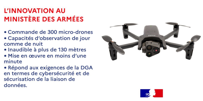 Parrot, Europe's leading drone group, was chosen by the Direction Générale de l’Armement (French defense procurement agency, DGA) to supply its ANAFI USA micro-drones to equip the three corps of the French Army (Air, Sea and Land), as part of its call for tenders launched last February.