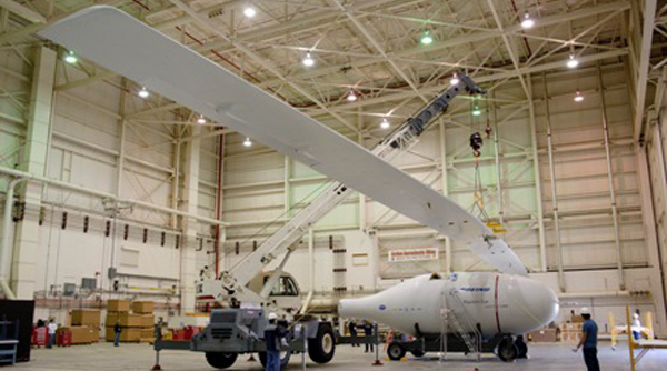 Phantom Eye being assembled at NASA Dryden, minus engines. The engines are undergoing testing at another facility. First flight is expected in early August, said Boeing.