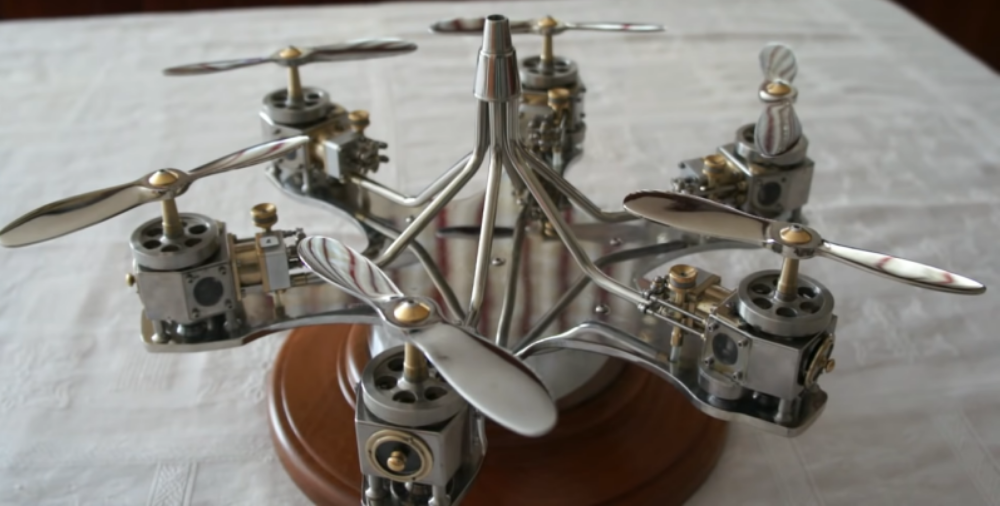 José Manuel Hermo Barreiro, also known as Patelo, is a retired naval mechanic with a love for scale model engines. Using only basic tools and a lathe, he has built a non-flying hexacopter display model, each propeller turned by a tiny single cylinder motor that runs on compressed air.