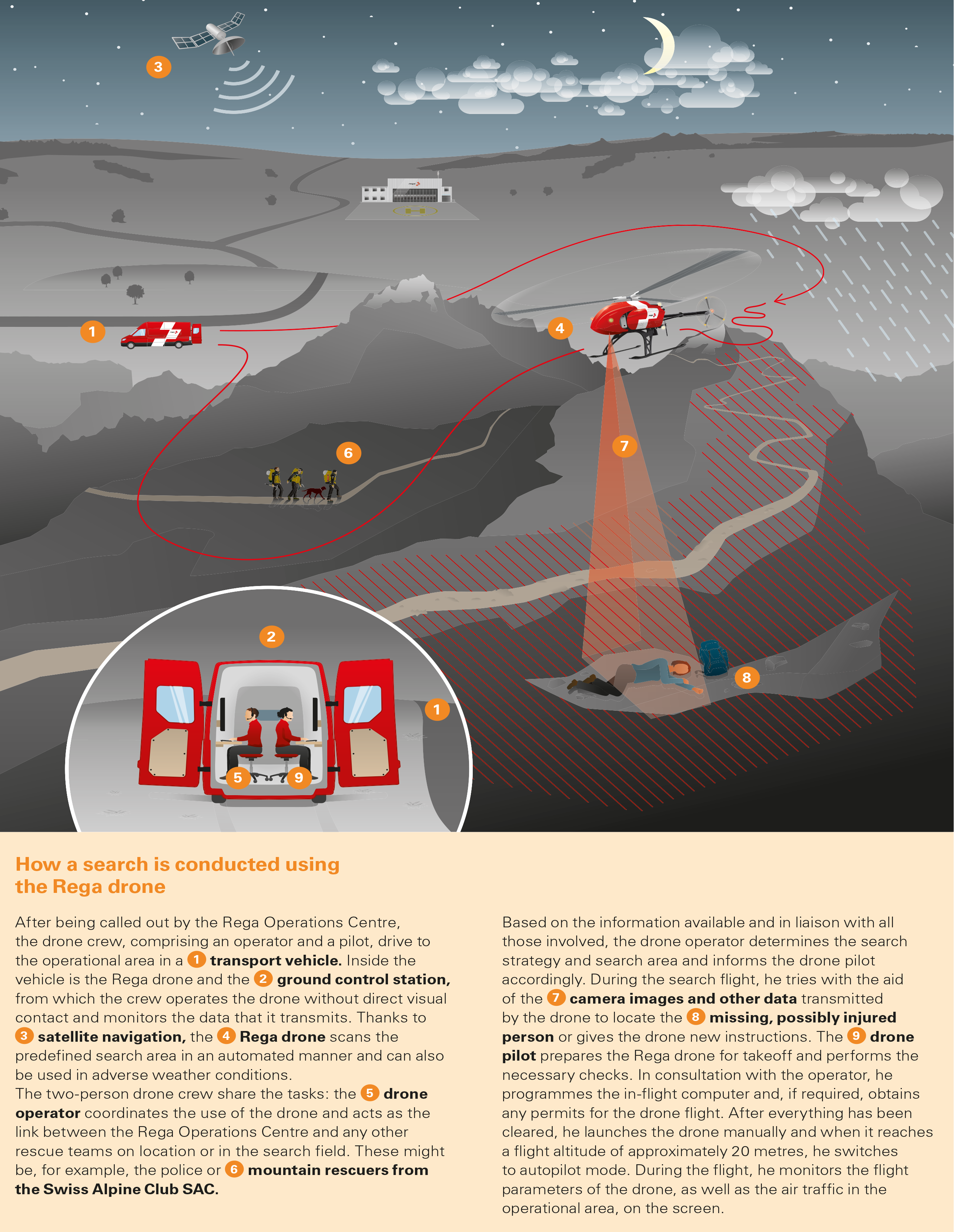 When developing the drone system, Rega was able to draw on its decades of experience in conducting countless search missions. In the last year alone, Rega searched for missing persons from the air on around 160 occasions because there was good reason to believe that a person needed help.