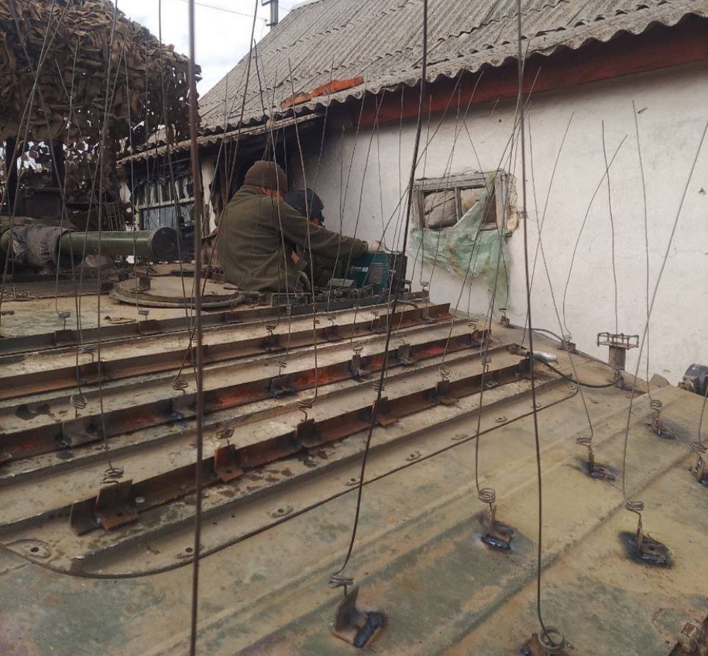 An unusual anti-drone protection method was spotted on a Russian BMP-1 armoured vehicle. In addition to the standard slat armor cage around the turret, there were metal rods welded to the hull front like antennas.