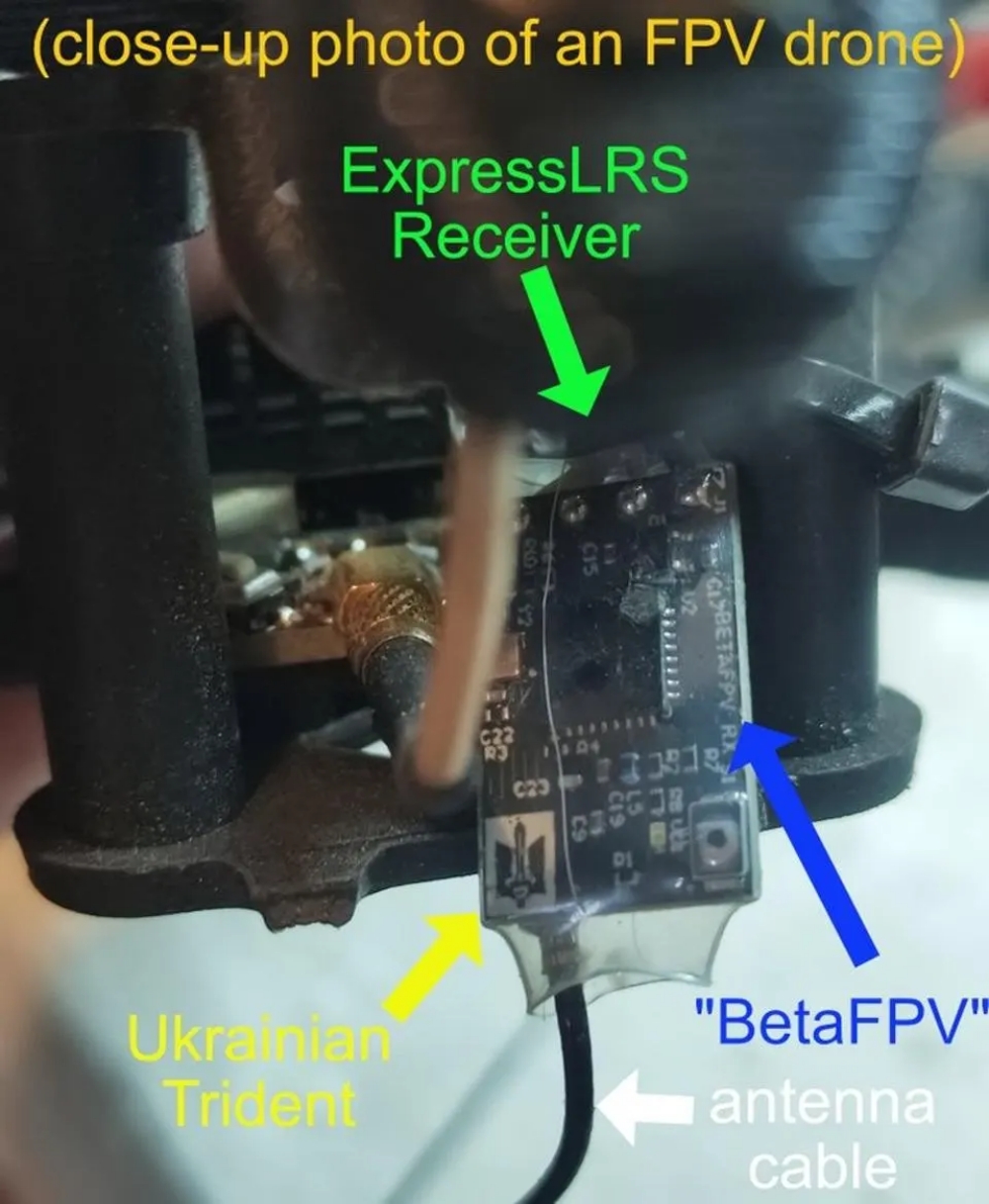 There is another way. DanielR, a physicist who follows drone tech in the Ukraine conflict, recently spotted images of an FPV drone with an unusual component, a radio communicator which looked like a standard ExpressLRS receiver but for one small detail.