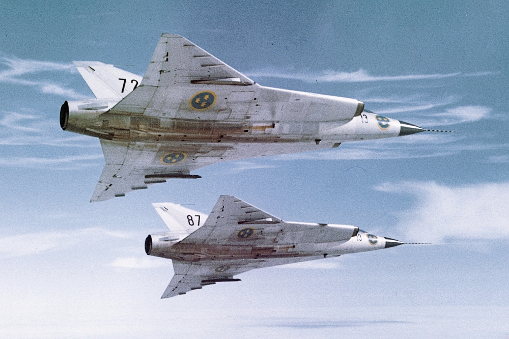 It featured an innovative but unproven double delta wing, leading to the creation of a sub-scale test aircraft, the Saab 210, which was produced and flown to test this previously unexplored aerodynamic feature. The full-scale production version entered service with frontline squadrons of the Swedish Air Force on March 8, 1960. It was produced in several variants and types, most commonly as a fighter-interceptor.