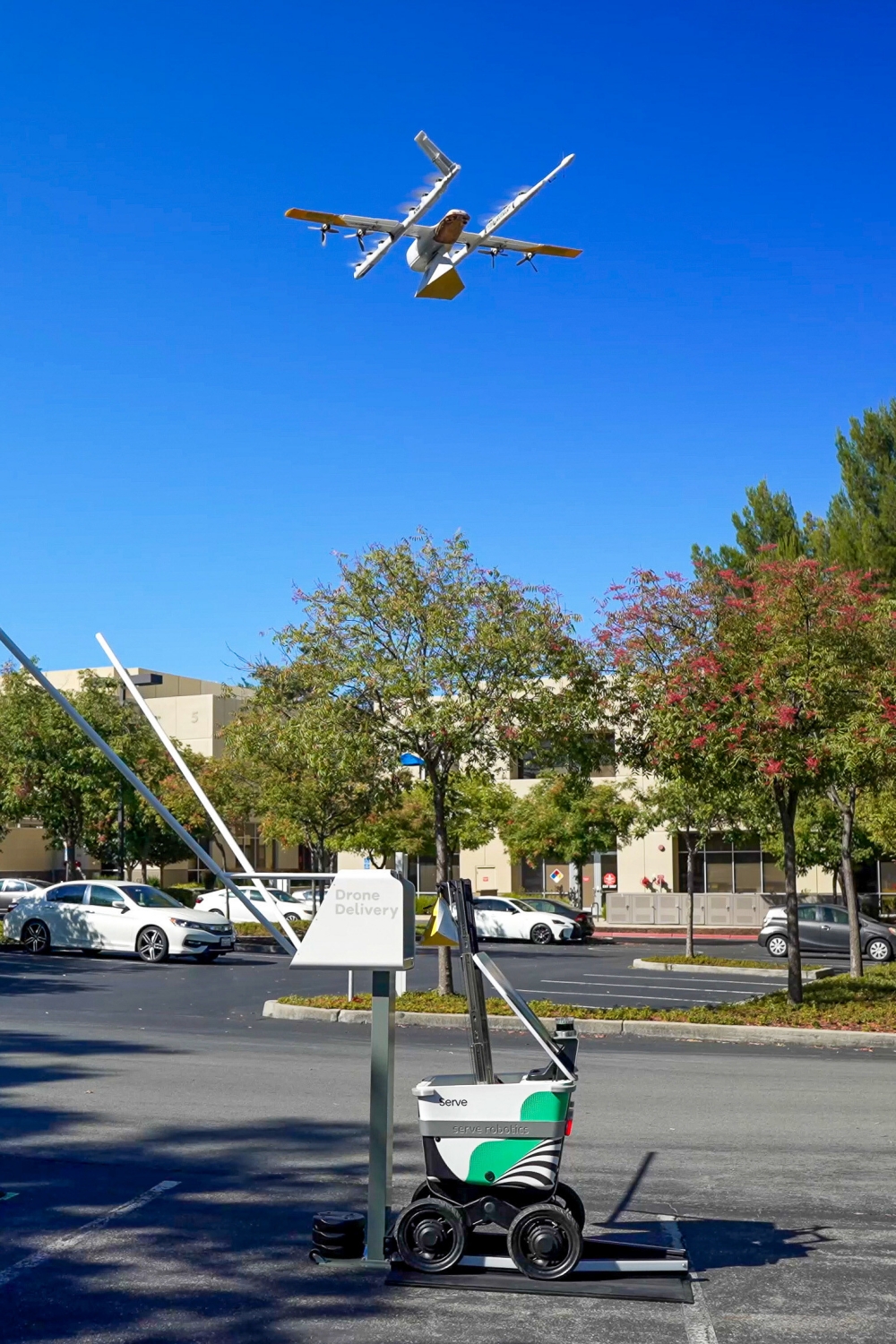 In the coming months, select Wing deliveries will be picked up by a Serve delivery robot from the restaurant's curbside and delivered to a Wing drone AutoLoader a few blocks away, for aerial delivery to customers as much as 6 miles away.