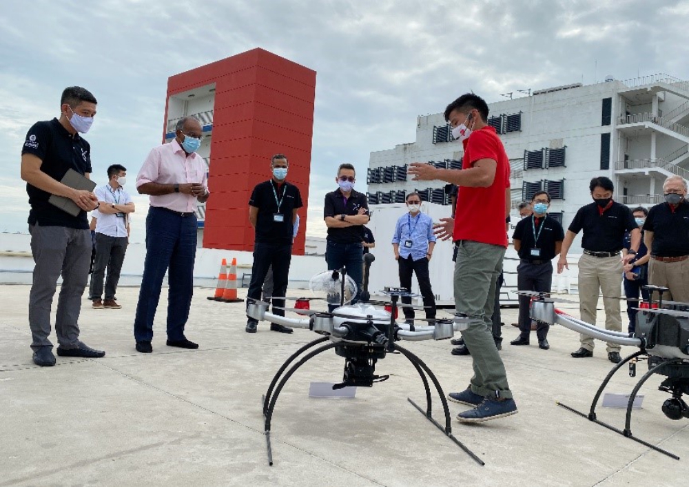 Mr K Shanmugam, Minister for Home Affairs and Minister for Law, viewed a BVLOS UAV flight demonstration at the Tuas View Fire Station. He said: