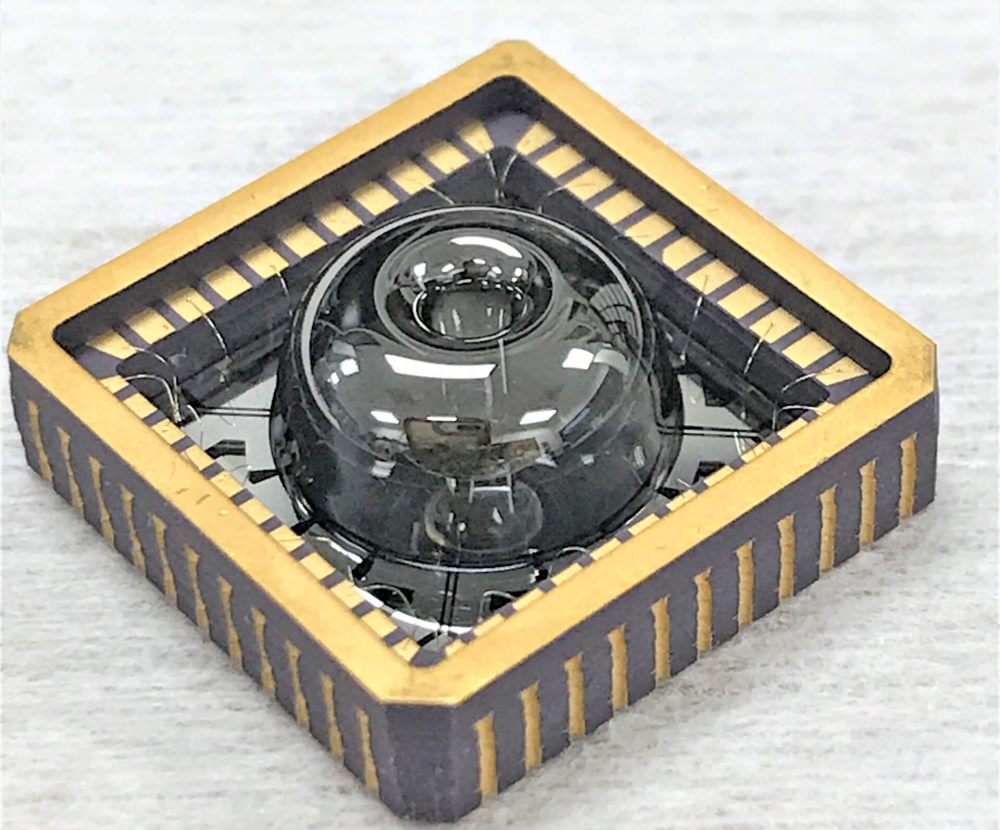 Then, they add a metallic coating to the shell and place electrodes around it that initiate and measure vibrations in the glass. The whole thing is encased in a vacuum package, about the footprint of a postage stamp and half a centimeter tall, which prevents air from quickly damping out the vibrations.