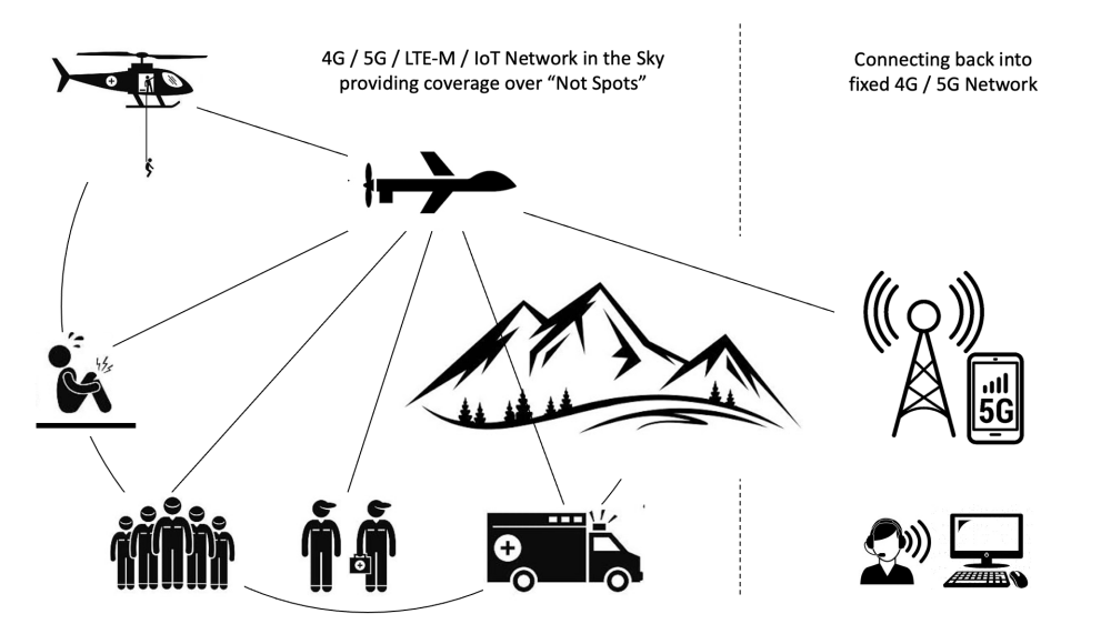 “Dragon’s Roar” is a collaboration between Snowdonia Aerospace (SAC), Swiftflight Avionics and WaveMobile to integrate an innovative airborne radio technology onto a light drone to create a 4G/5G network-in-the-sky for operation in areas of poor mobile signal connectivity – so called “not spots” – that can be used by Emergency Services to locate missing persons and coordinate with ground personnel to effect a rescue.