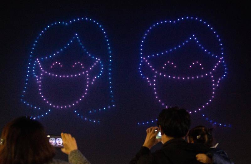 More than 300 drones flew in the performance above Olympic Park in southern Seoul, forming images of people wearing masks and spelling out messages thanking people and medical workers for the country's anti-virus gains.