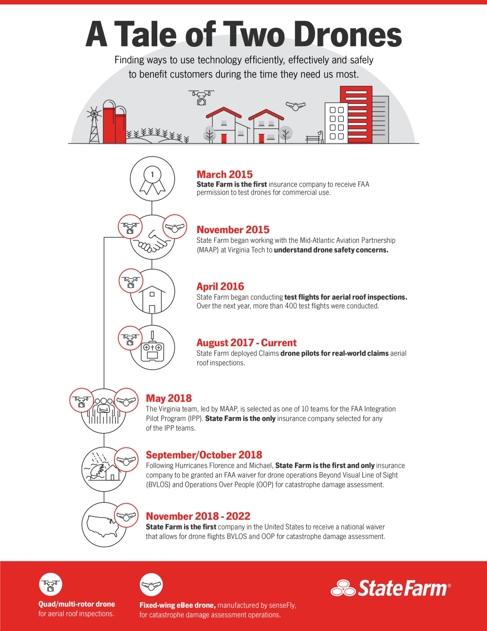 Current FAA regulations restrict pilots from flying drones beyond their visual line of sight and over groups of people. In a catastrophe situation, access to the impacted area may be challenged by water, debris and damage to infrastructure. The national waiver will also open up new innovation opportunities for State Farm by allowing longer-distance flights.