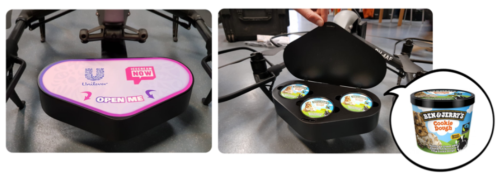 During the demonstration, a multi-copter drone was fitted with delivery box (Figure 1) designed to carry three Ben & Jerry’s mini cups (72 g each). A flight path was set beforehand to allow the drone to carry the ice cream cups inside the Unilever’s US facility.