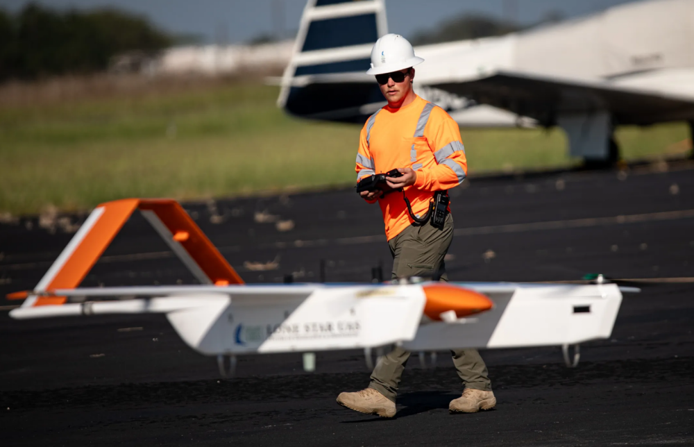 Top Photo: Lone Star UAS senior pilot Grady Booth launches the Commaris Seeker, a long range electric fixed-wing drone weighing less than 55-pounds, during a field test at Nueces County Airport on Friday, Sept. 29, 2023, in Robstown, Texas