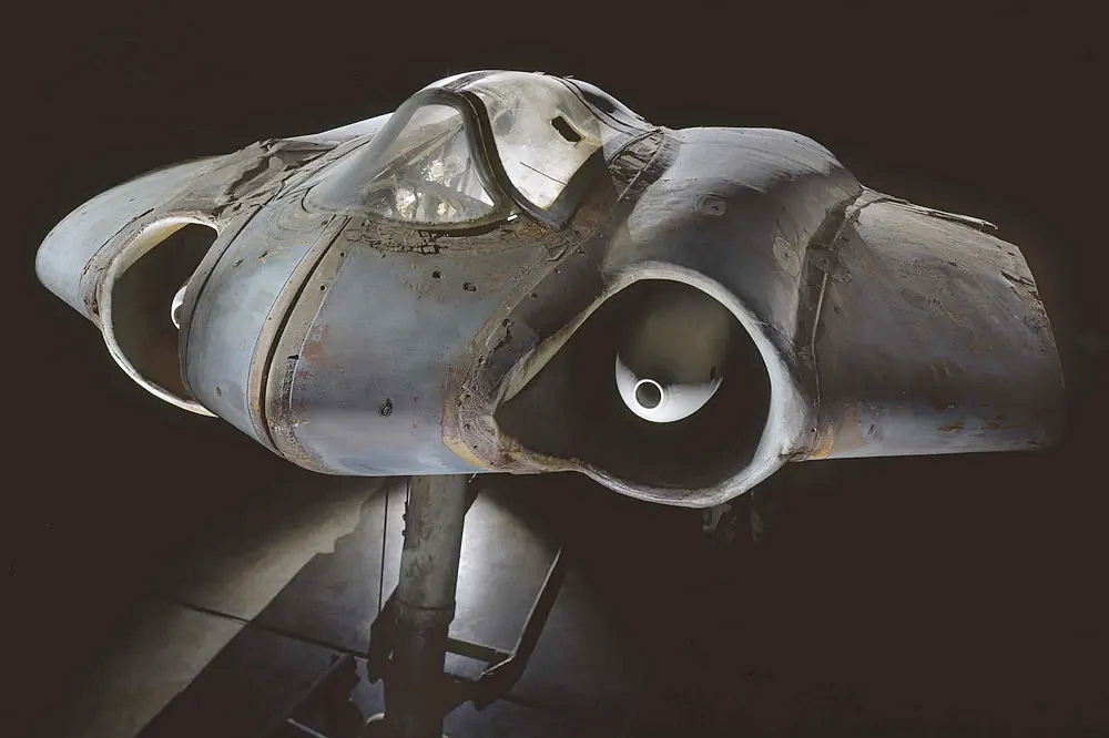 Today, the experimental aircraft is on display in the museum’s Boeing Aviation Hangar in an exhibit that features the center section of the plane standing on its landing gear with cockpit and jet engines clearly visible. The wings with Balkenkreuz—the German cross insignia—are stored nearby.