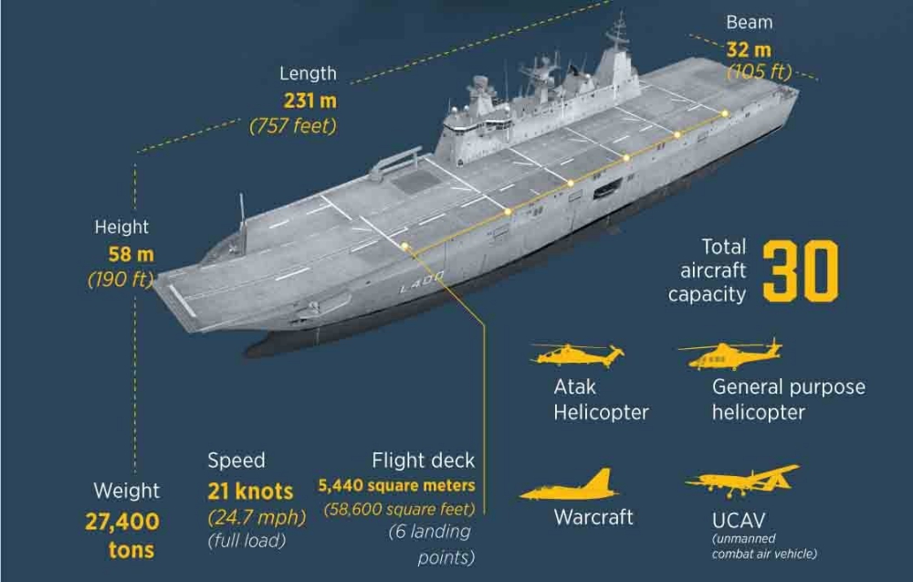 Based on Spain’s flagship, the Juan Carlos I, the TCG Anadolu is a landing helicopter dock (LHD) type amphibious assault ship. It is 231 meters (758 feet) long and 32 meters wide and boasts a displacement of 27,436 tons. It has a top speed of around 21 knots, a range of 9,000 nautical miles and can operate at sea for 50 days.