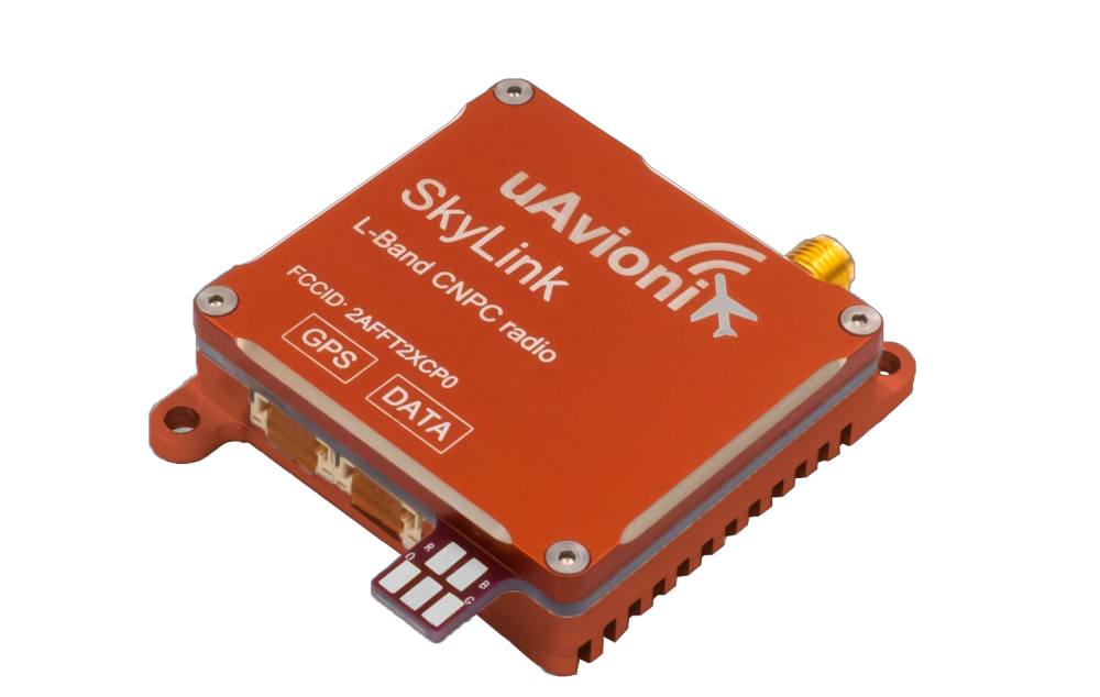 “skyLink” is an L-Band frequency modulated CNPC radio ultimately intended for point-to-point or networked Beyond Visual Line of Sight (BVLOS) UAS operations. True to form, uAvionix has focused on minimizing size, weight, and power consumption (SWaP) while maximizing range and spectrum efficiency. The current 50g 10-Watt prototype is testing successfully at ranges exceeding 40 miles at low altitude. uAvionix is testing under an experimental transmit license and approval from the Federal Communications Commission (FCC) and Federal Aviation Administration (FAA) respectively.