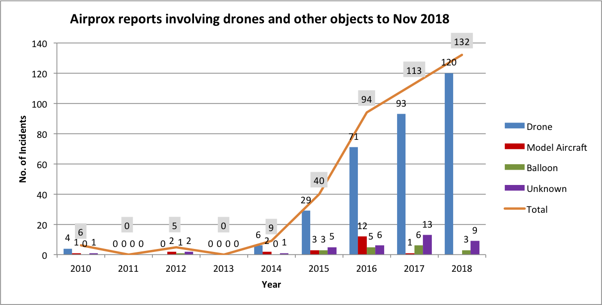The UK Airprox Board, sponsored jointly, and funded equally, by the UK Civil Aviation Authority (CAA) and the UK Military Aviation Authority (MAA)., issues monthly statistics of near misses (Airprox) incidents in the UK. The latest figures published for 2018 show a continued rise of incidents involving drones and civil aircraft.
