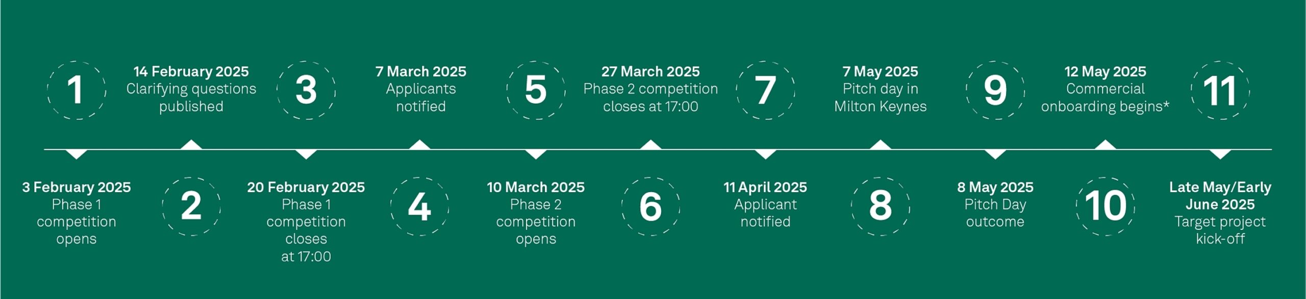 Total budget, up to £60,000Project duration 12 weeksPhase 1 competition opens Monday 3 February 2025Phase 1 competition closes Thursday 20 February 2025 at 17.00Applicants notified Friday 7 March 2025Phase 2 competition opens Monday 10 March 2025Phase 2 competition closes Thursday 27 March 2025 at 17.00