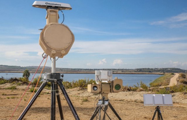 Detection is provided by a combination of a RADA Innovative Defense Electronics RPS-42 pMHR S-band multimission 90° hemispheric radar (four radars to give full 360° coverage), the Controp MEOS electro-optical/infrared (EO/IR) surveillance suite, and the NetSense Wideband detection sensor developed by Netline; command-and-control is provided by a command console; and the effector can be the Lite Beam laser, the C-Guard RD jammer, or even a high-pressured water gun depending on the threat.