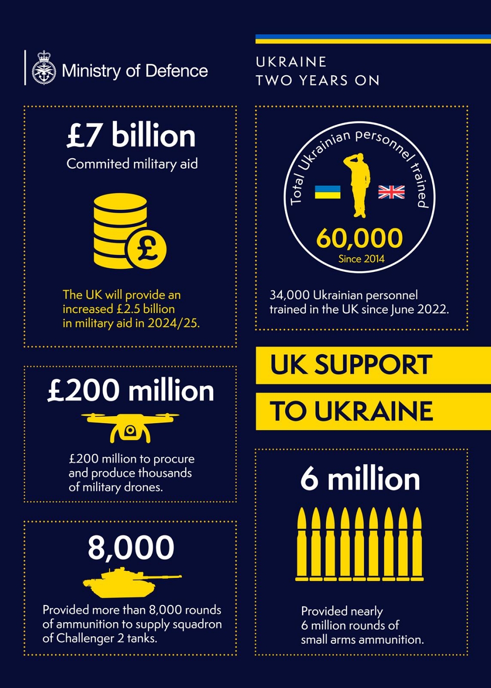The UK is committed to standing with Ukraine for as long as it takes and has committed to provide £2.5 billion in military aid to Ukraine in 2024/25, an increase of £200 million on the previous two years.