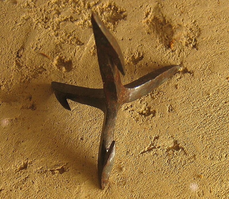Roman caltrops were jagged so that the point would stick in a horse’s hoof and be difficult to remove. Caltrops in various forms were used all through the ancient and medieval era, and were still in use in the eighteenth century.