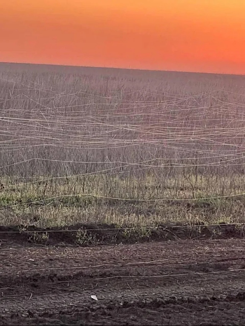 This photo of a field in the Ukrainian war zone covered with fiber optic cables left by FPV drones appeared recently in reddit.