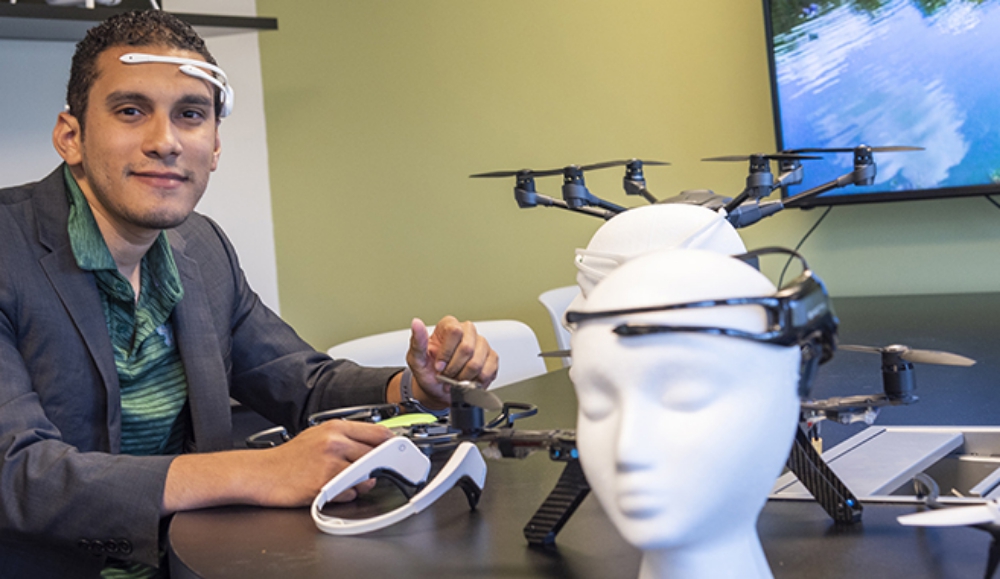 “When you imagine a movement, your brain produces the same electrical activity as if you were performing the movement with you muscles,” Andujar said. “For drone-racing, we have our pilots imagine they’re pushing an object forward. Then, we capture that signal, classify it and send the information to the drone, which has already been programmed to move when it receives that data.”