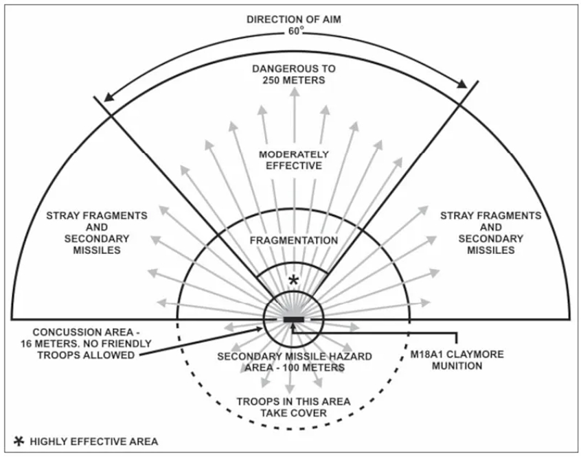 Its curved plastic casing contains C-4 explosive and about 700 steel ball bearings, which are propelled in a 60-degree cone-shaped blast to an effective range of about 820 feet (250 meters).