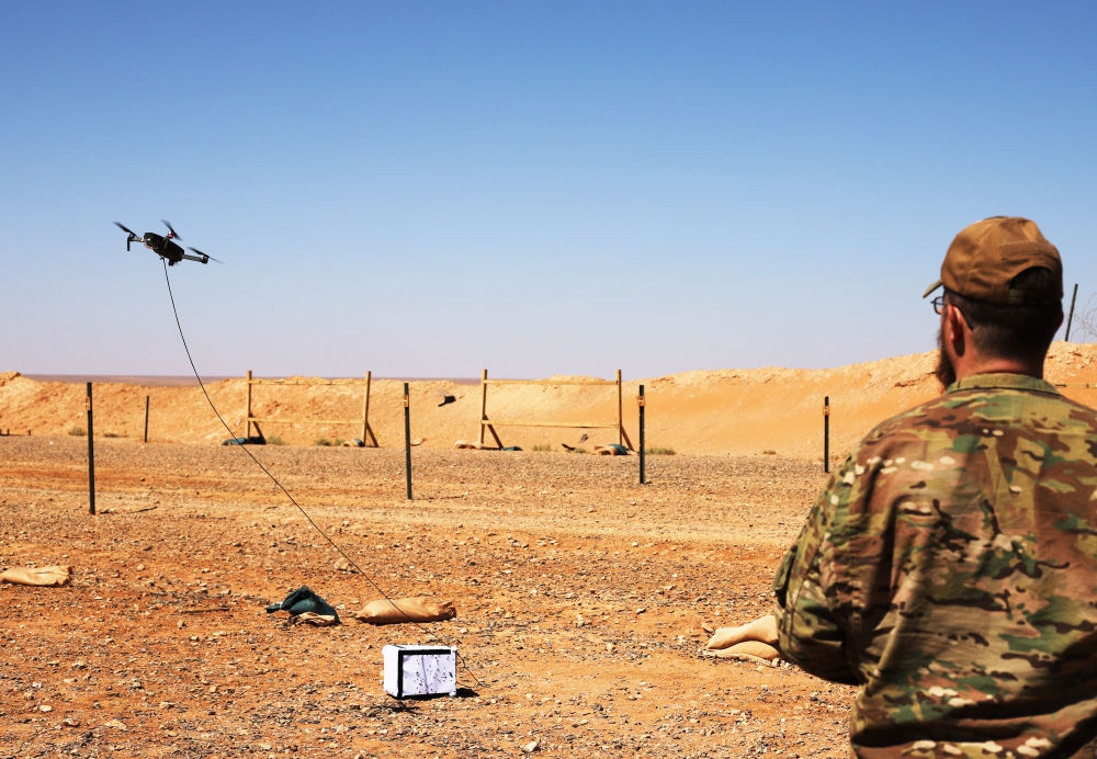 The photos — posted on the Defense Visual Information Distribution Service — showed special operators at the al-Tanf base in southern Syria using the Smart Shooter SMASH 2000 sighting system mounted on their M4A1 carbines. They were shown firing on range targets and also at a box in the air suspended below a small drone.