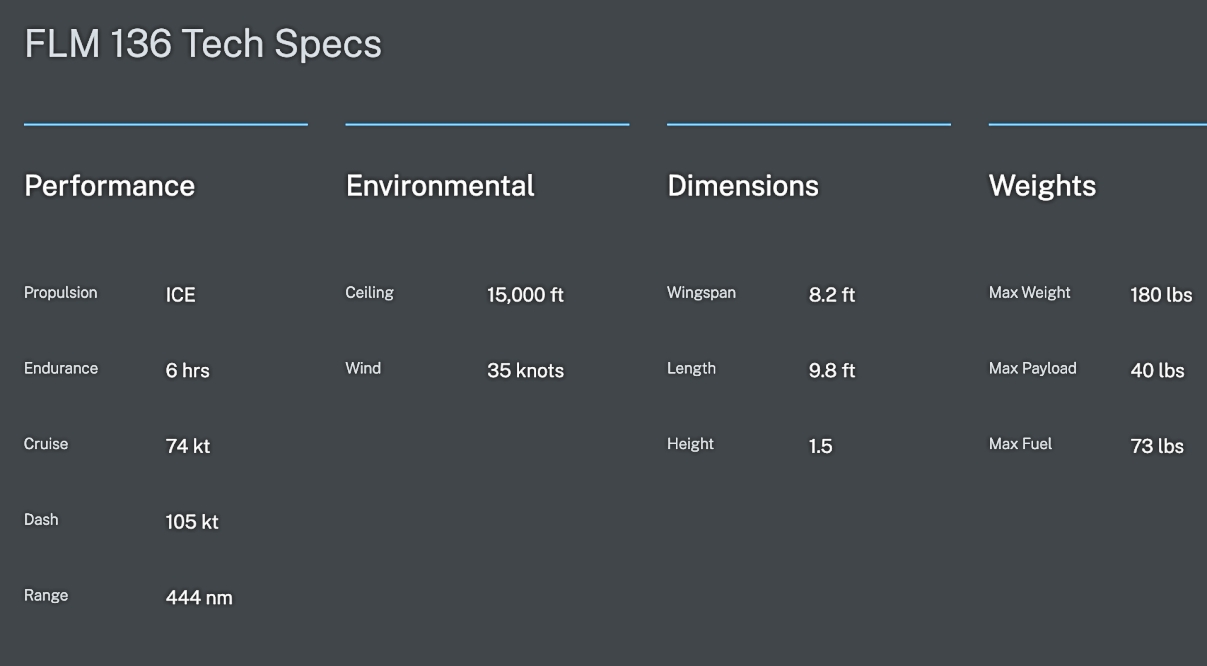 The drone uses an FLM 131 attritable platform and is equipped with highly compatible guidance systems designed to meet stringent size, weight, and power (SWaP) requirements. Its payload network enables remote cycling of onboard systems during flight and supports both 28V and 12V power sources.