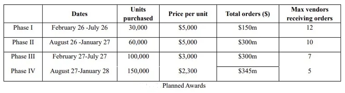 Over the course of the next three gauntlets, the number of vendors will go down from 12 to five, the number of drones ordered will increase from 30,000 to 150,000, and the price per drone will drop from $5,000 to $2,300.