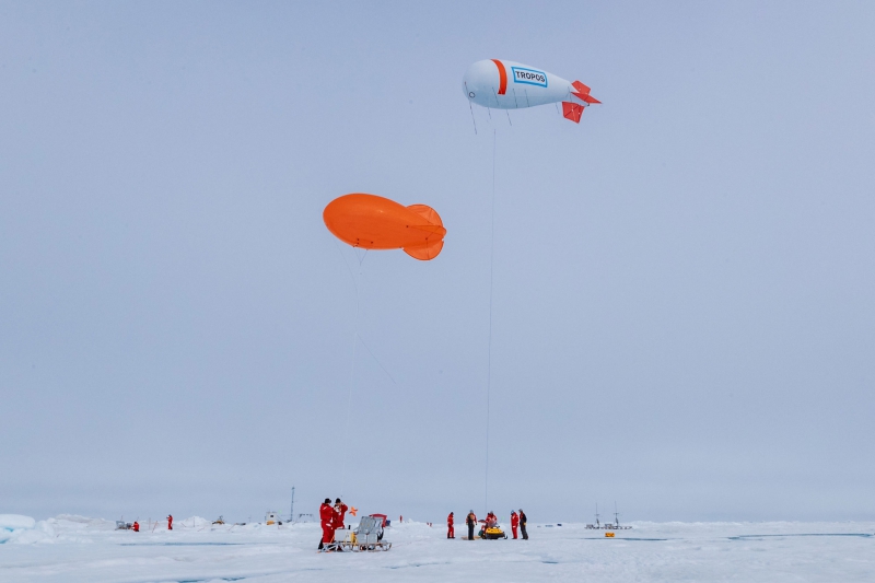 The drones at times proved more resilient to the rough Arctic weather than some of the expedition’s other flying objects. Two tethered balloons nicknamed Beluga and Miss Piggy would be sent to take cover from hard conditions in bright orange tent known as Balloon Town.