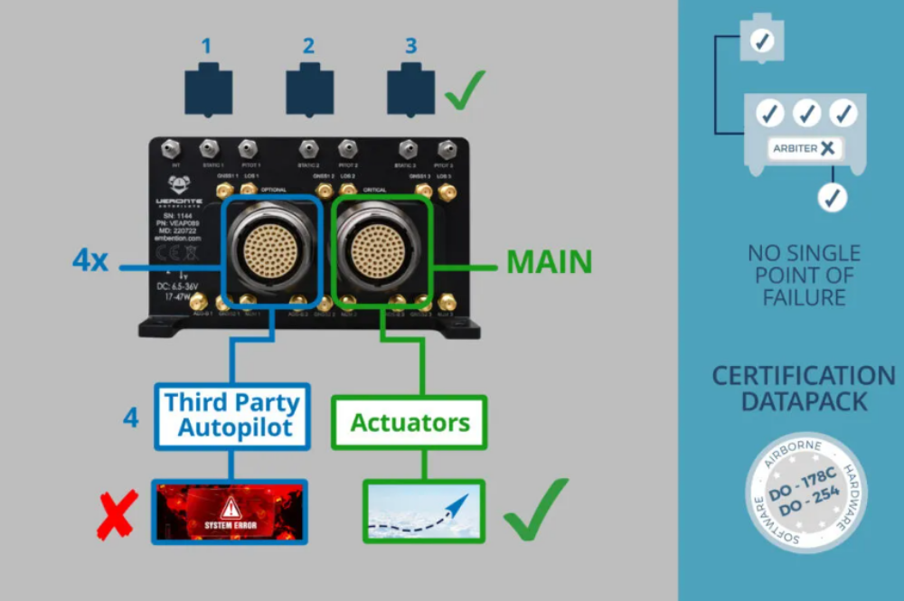 This innovative way of using the Veronte Autopilot enables the use of non-certifiable avionics and mission computers in drones and eVTOL, maintaining the high levels of reliability required in aviation. The arbiter in Veronte Autopilot 4x will isolate the non-certifiable avionics from the critical path, taking the control of the aircraft for the continuation of the mission or to terminate it by flying to a safe landing area, in case of failure.