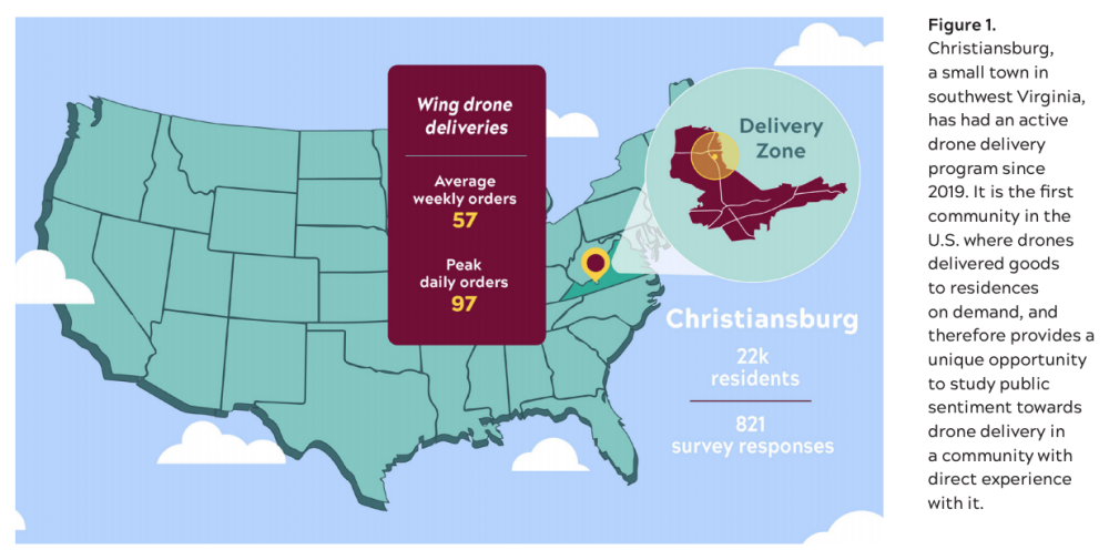 Christiansburg, Virginia, a town of roughly 22,000 people, is the site of the most advanced residential drone delivery trial in the United States, launched by the Alphabet subsidiary Wing in October 2019. Virginia Tech researchers conducted a survey in November 2020 to assess the community’s sentiment.