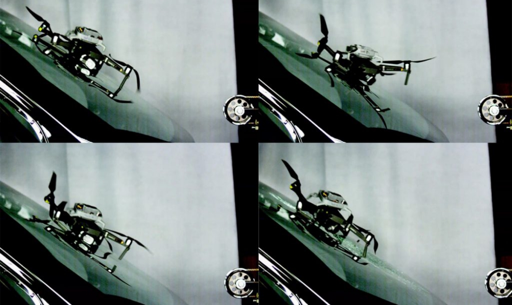 A drone slams into a windshield. The drone's shell cracks, and the windshield shudders. Pieces of a propeller snap off. But the windshield doesn't shatter.