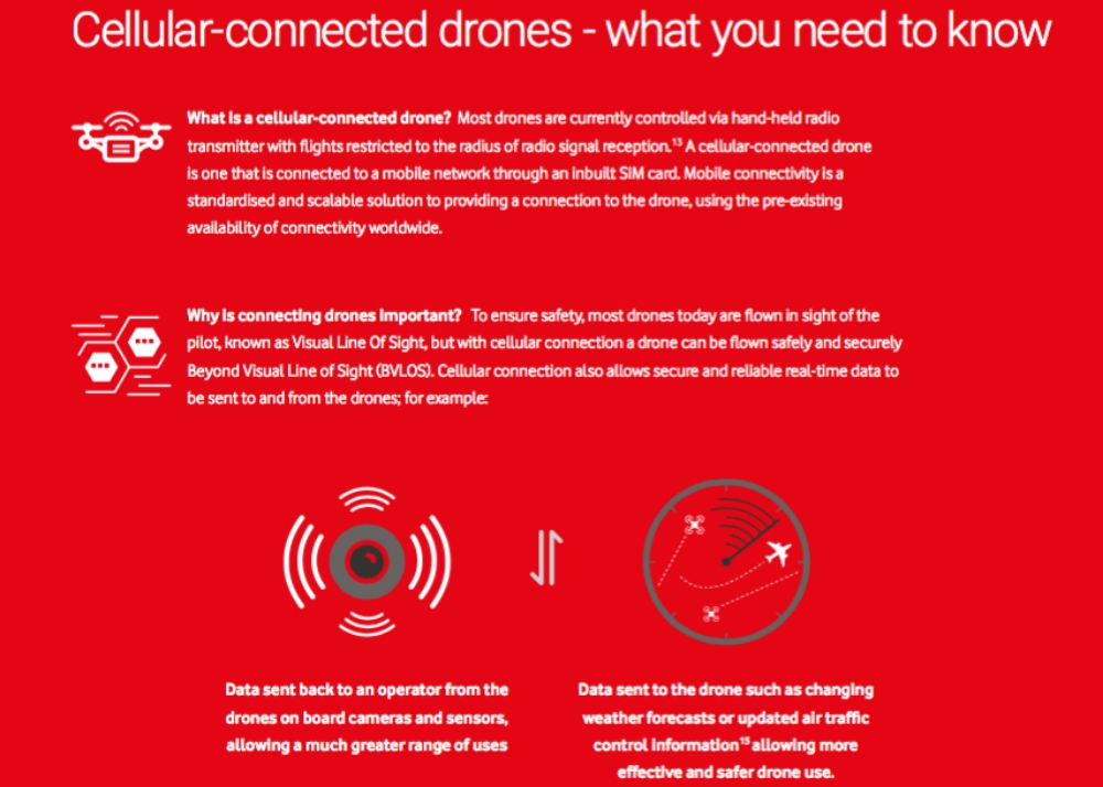 Cellular connection would also facilitate a necessary Unmanned Traffic Management system to monitor drone identity, location and flight plan authorisation, as well as enable dynamic no-fly zones, Vodafone argues.