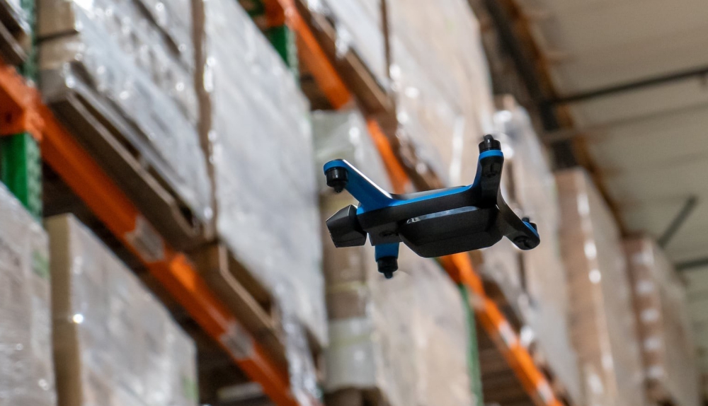 - Self-flying drones soar throughout the warehouse, collecting images of pallet locations, data from barcodes, and other inventory information.