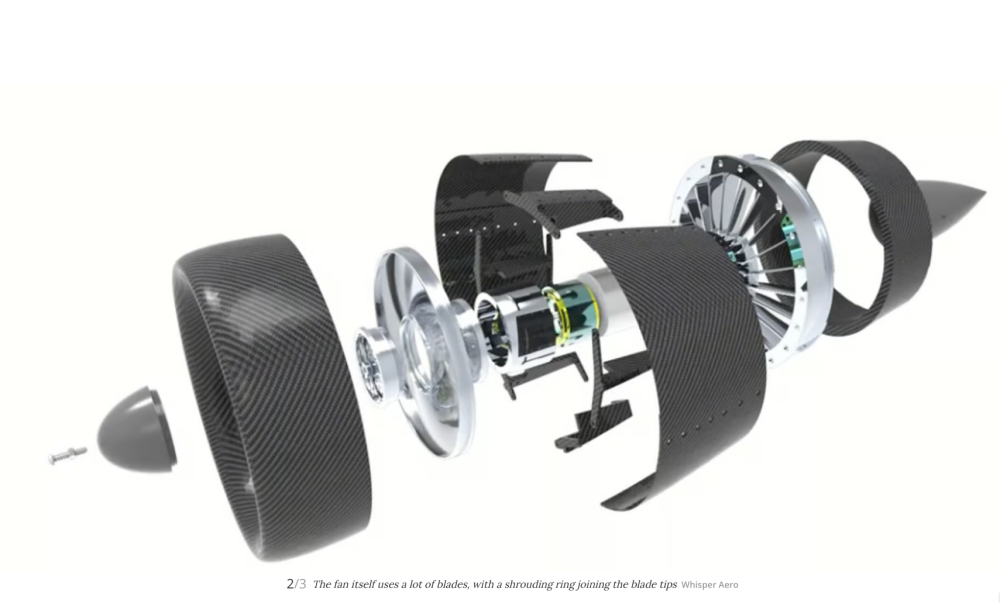 Inside the Whisper propulsion unit, there's a "propulsion disc" that's essentially a fan, one with an unusually large number of strong, stiff blades, joined at the outer circumference by a shrouding ring for additional strength. It's a small diameter fan, in order to keep the blade tip speed low while it's spinning at flight-relevant RPMs.