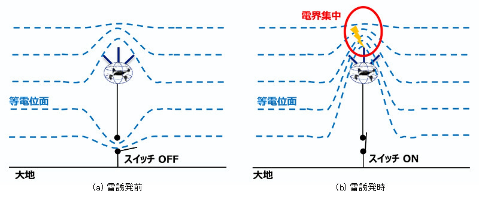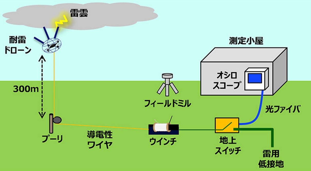 In order to trigger lightning by drones, the drone must continue flying even when lightning strikes. Furthermore, since it is difficult to strike lightning by simply flying a drone under a thundercloud, it is necessary to actively induce lightning. To achieve this, we proposed and demonstrated the following two technologies (1) and (2).