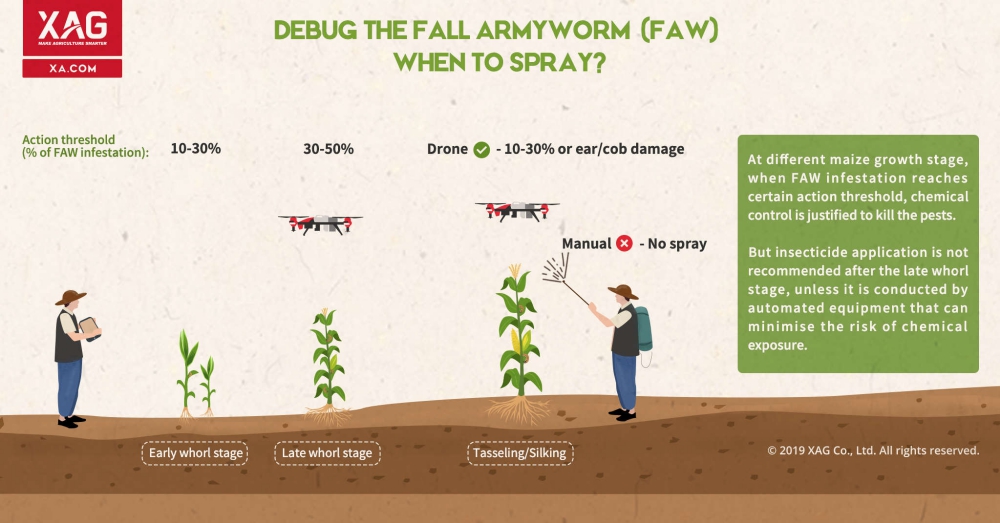 Chemical control remains one of the most widely deployed methods to contain the spread of fall armyworm. However, most farmers usually resort to traditional sprayers and, in many cases, find the effect disappointing while exposing themselves to the hazard of pesticide poisoning. Manual spraying not only fails to meet the demand for a quick, emergent control over the ravenous, fast-moving fall armyworm, but also makes it difficult for pesticides to contact the hidden caterpillars because of uneven hand sprays.